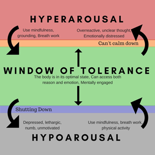 Чим більше ви практикуєте, тим легше вам буде їх використовувати. Дуже важливо, щоб ви розвинули усвідомлення власної системи стресу. Ви можете використовувати систему вікна толерантності, наведену нижче, щоб ознайомитися з власним вікном толерантності. Чим більше ви усвідомлюєте власні реакції на стрес і вікно толерантності, тим легше вам буде мобілізувати техніки емоційної регуляції в потрібний момент.
