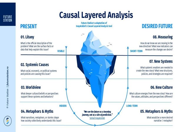 Ось приклад того, як модель айсберга може бути використана для роботи над колективними проблемами, такими як зміна клімату, на основі причинно-наслідкового аналізу Сохаїла Інаятулли.
